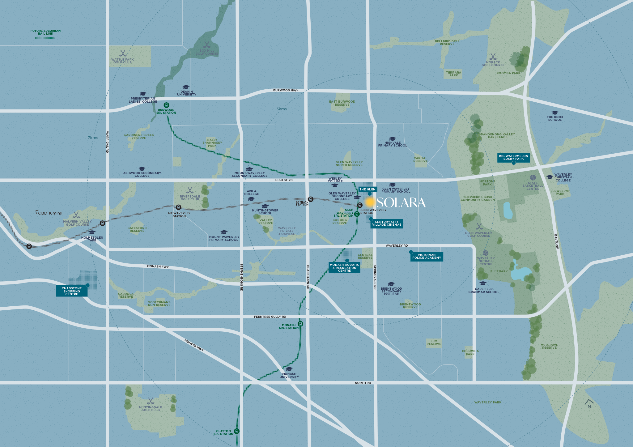 Solara is perfectly positioned in one of the city’s very best locations. Living here, you’re surrounded by both bustling village life and peaceful green parklands, with direct connections to the centre of Melbourne conveniently close by train or the nearby Monash Freeway.
